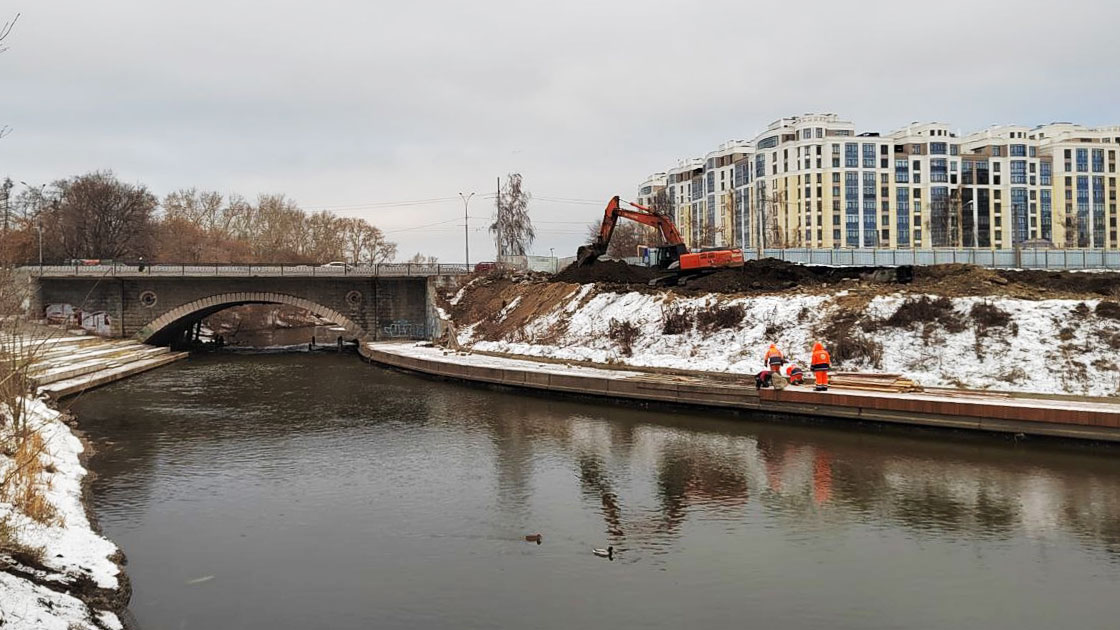 Строители ГУДСР и спецтехника активно работают на участке. Русло временно засыпано скалой, под насыпью проложены трубы для сохранения течения.